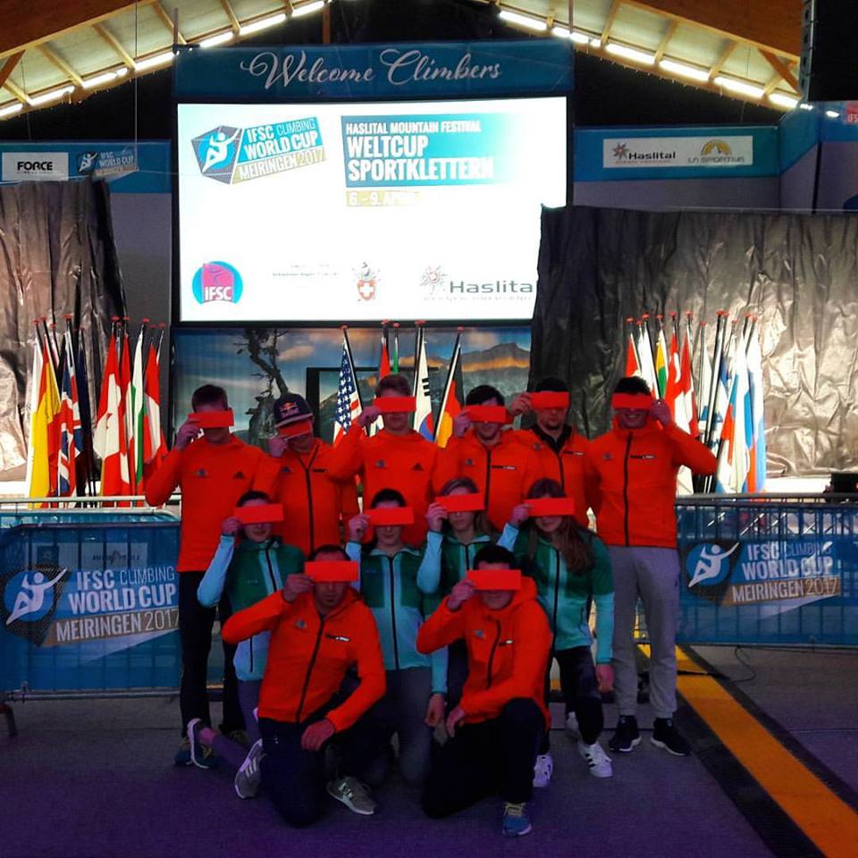 Slovenski reprezentantje na odprtju tekme SP Meiringen 2017 v znak nestrinjanja z odločitvijo IFSC, da ukine brezplačne spletne prenose tekem. (vir FB Slovenia Climbing)