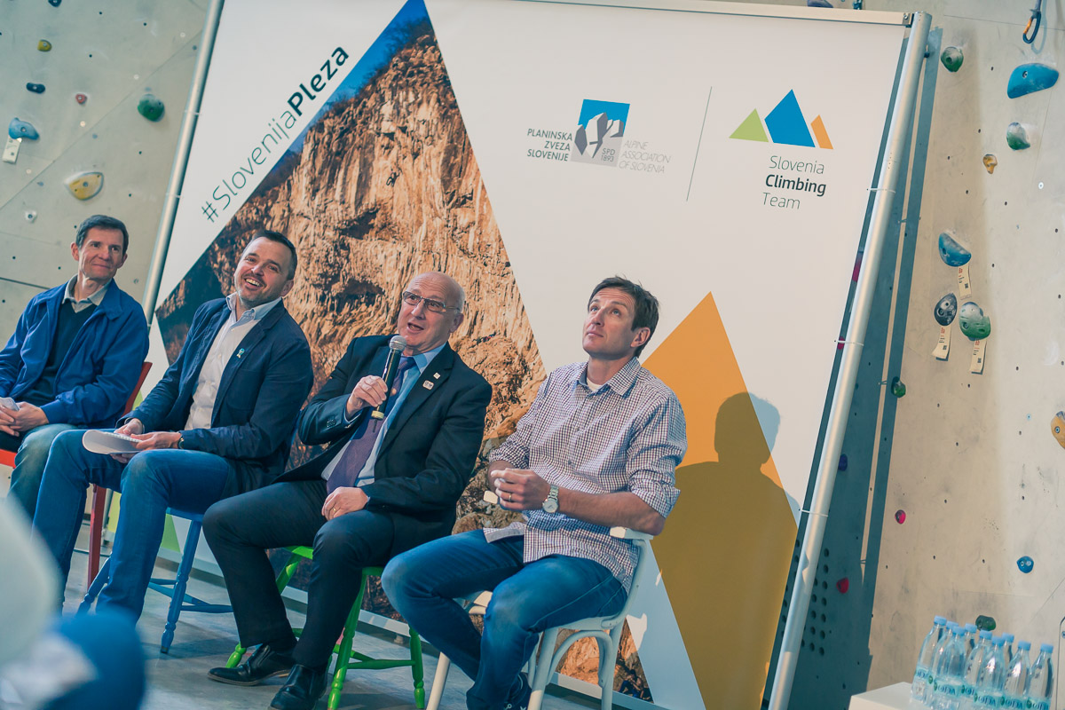 Načelnik Komisije za športno plezanje PZS Aleš Pirc, generalni sekretar PZS Matej Planko, predsednik OKS-ZŠZ Bogdan Gabrovec in podpredsednik OKS-ZŠZ Iztok Čop (foto Sebastjan Plavec)