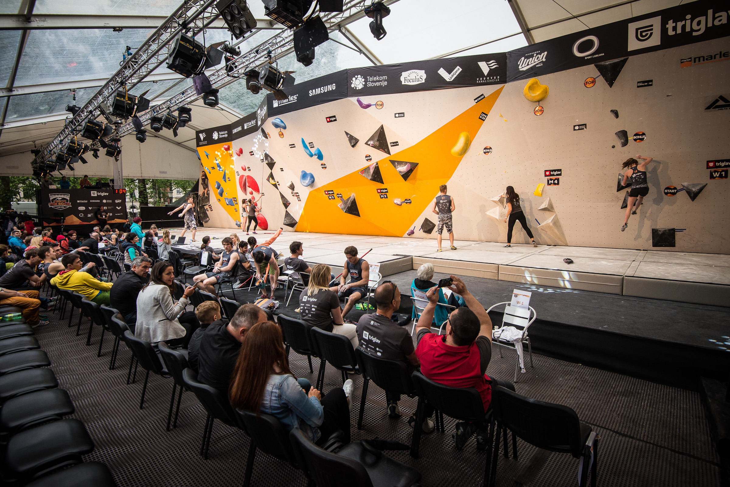 Kot je po prvem delu tekmovanja povedal Domen Škofic, vreme ne vpliva na tekmovalce, saj na steni zaradi montažne strehe, ki jo je organizator postavil ob slabši vremenski napovedi, nimajo občutka, da dežuje. Tudi vzdušje na Kongresnem trgu v Ljubljani je odlično, naključni obiskovalci in ljubitelji plezanja z bučno podporo navijajo predvsem za domače plezalce. Pred začetkom tekmovanja so se nekateri preizkusili tudi v aktivacijskem kotičku, kjer so lahko na različno postavljenih stenah preizkusili svoje plezalne sposobnosti in naredili prve korake v balvanskem plezanju.