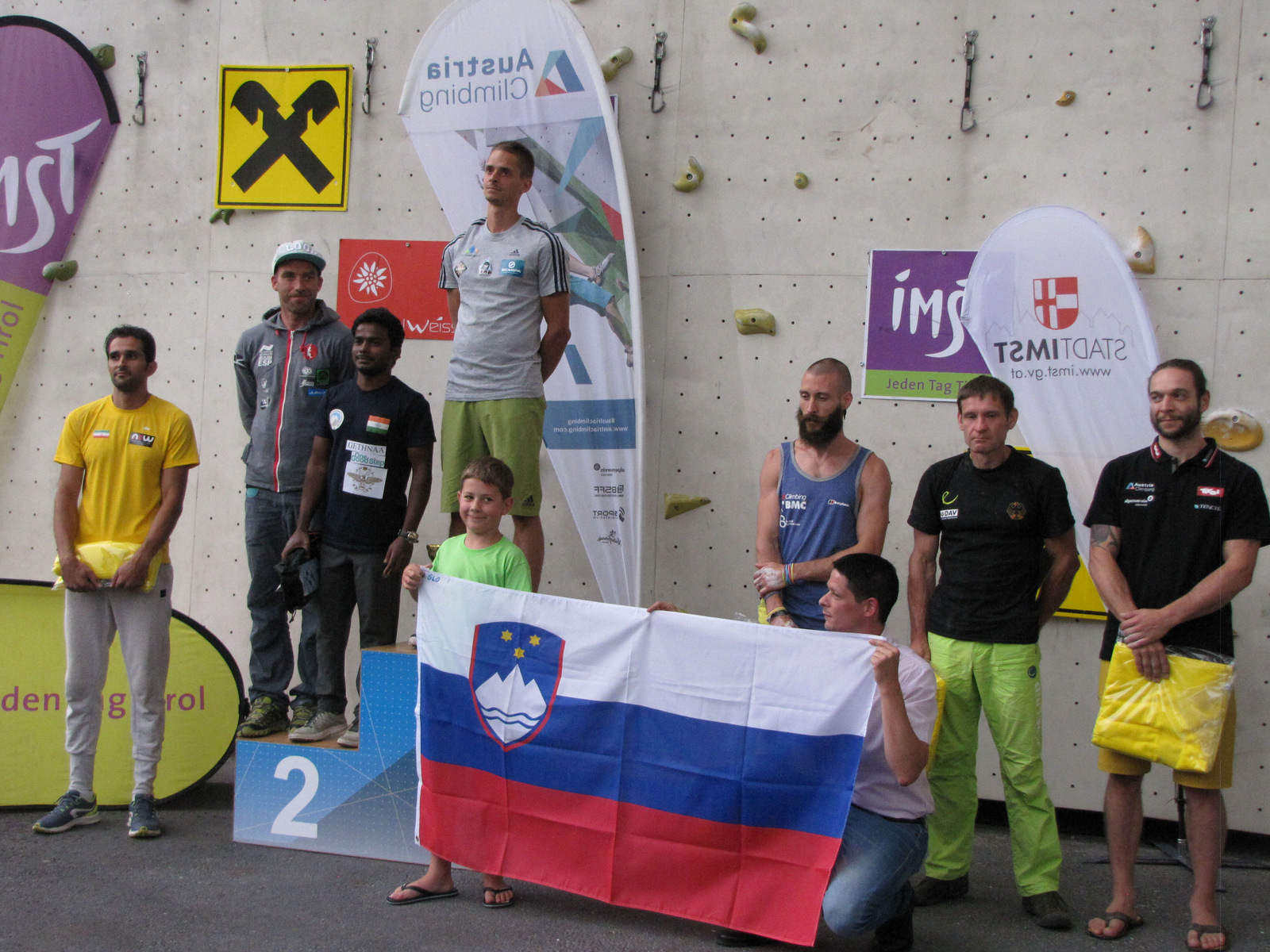 Škofjeločan Gregor Selak na najvišji stopnički paraplezalnega mastersa v Imstu (foto Jurij Ravnik)