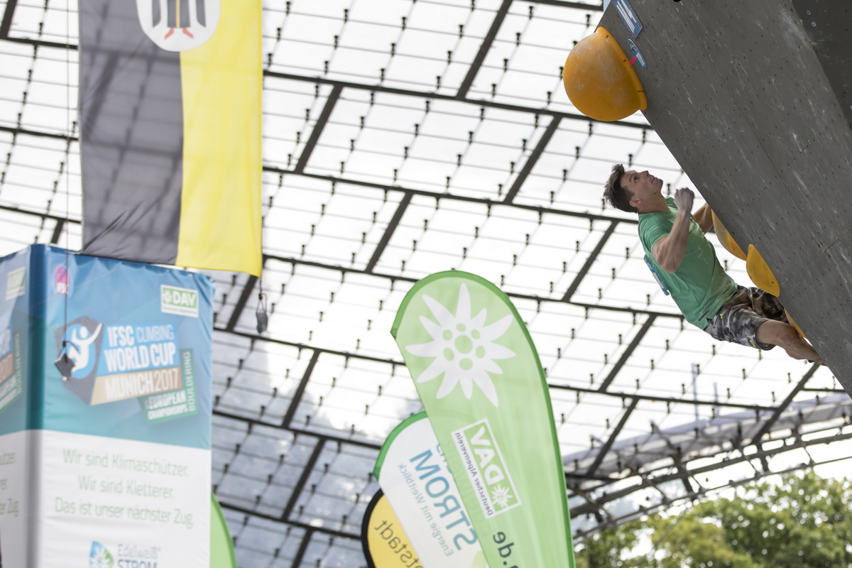 Tik pod stopničkami, na četrtem mestu, je evropsko prvenstvo končal Jernej Kruder (ŠPO PD Celje Matica), ki je leta 2014 v Münchnu postal svetovni podprvak, tokrat pa je bil 29. v moški konkurenci svetovnega pokala in z dobrim nastopom dosegel tudi peto mesto v kombinaciji evropskega prvenstva. "Na tekmo v München sem prišel bolj zaradi svetovnega pokala, kar se mi na žalost ni izšlo, dobil pa sem redko priložnost, da sem se uvrstil med najboljših 20 Evropejcev in izboljšal rezultat na evropskem prvenstvu. Zadovoljen sem s svojim plezanjem, je pa v svetovnem pokalu veliko odvisno od malenkosti, saj nas je preveč, da bi lahko dopustili majhne napake, ki so tudi mene stale finala svetovnega pokala in stopničk evropskega prvenstva," je svoj nastop ocenil 26-letni Celjan.