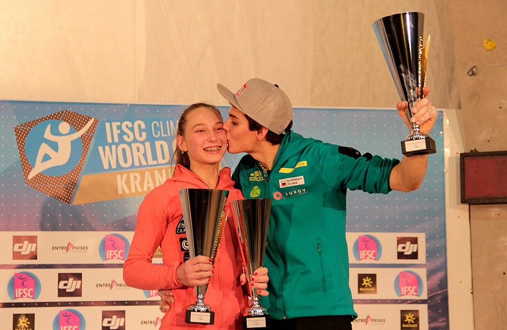 Janja Garnbret in Domen Škofic lani v Kranju na vrhu svetovnega pokala 2016 (foto Manca Čujež)
