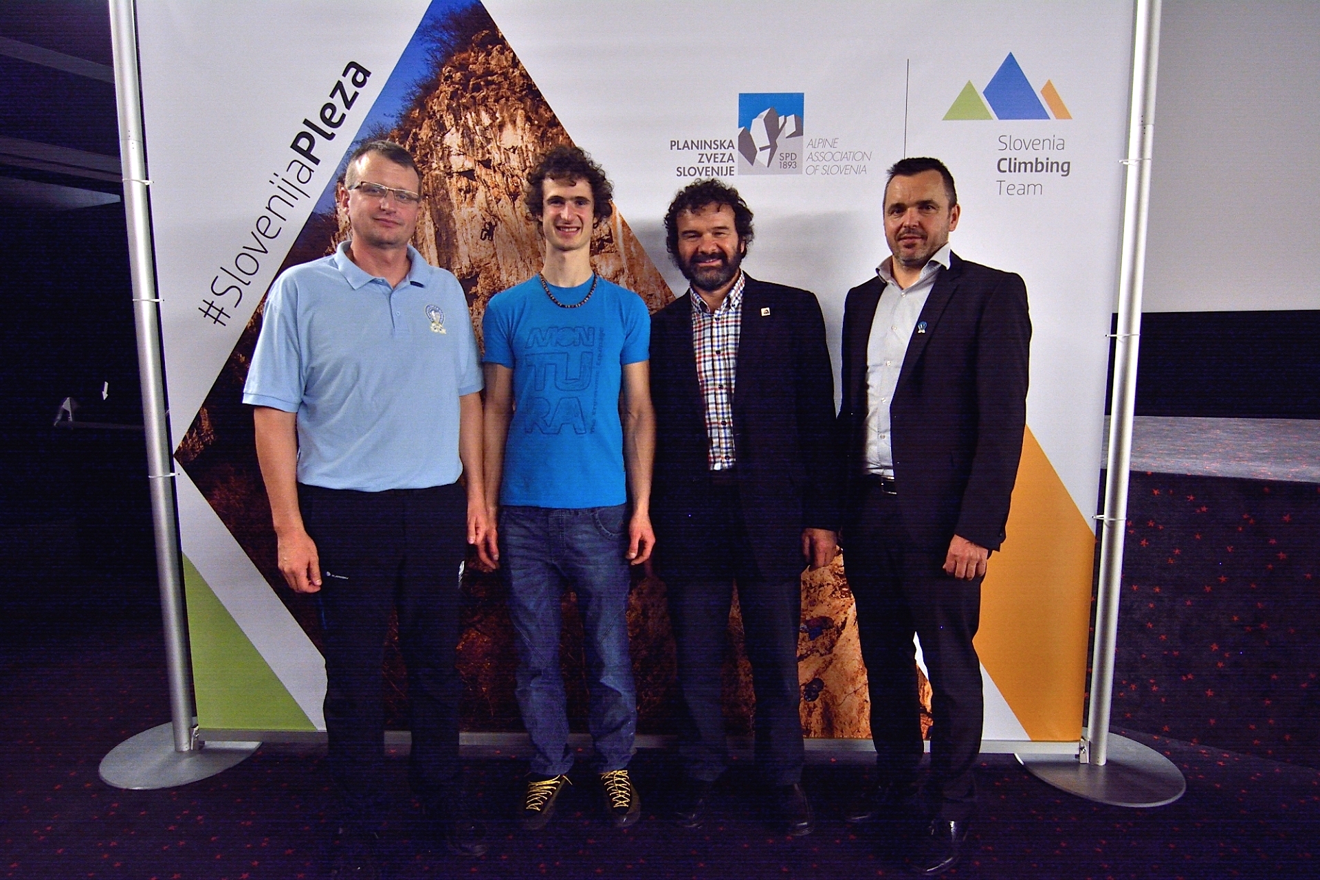 Predsednik Planinske zveze Slovenije Bojan Rotovnik, češki mojster navpičnice Adam Ondra, predsednik Češke planinske zveze Jan Bloudek in generalni sekretar PZS Matej Planko (foto Gregor Jeraša)