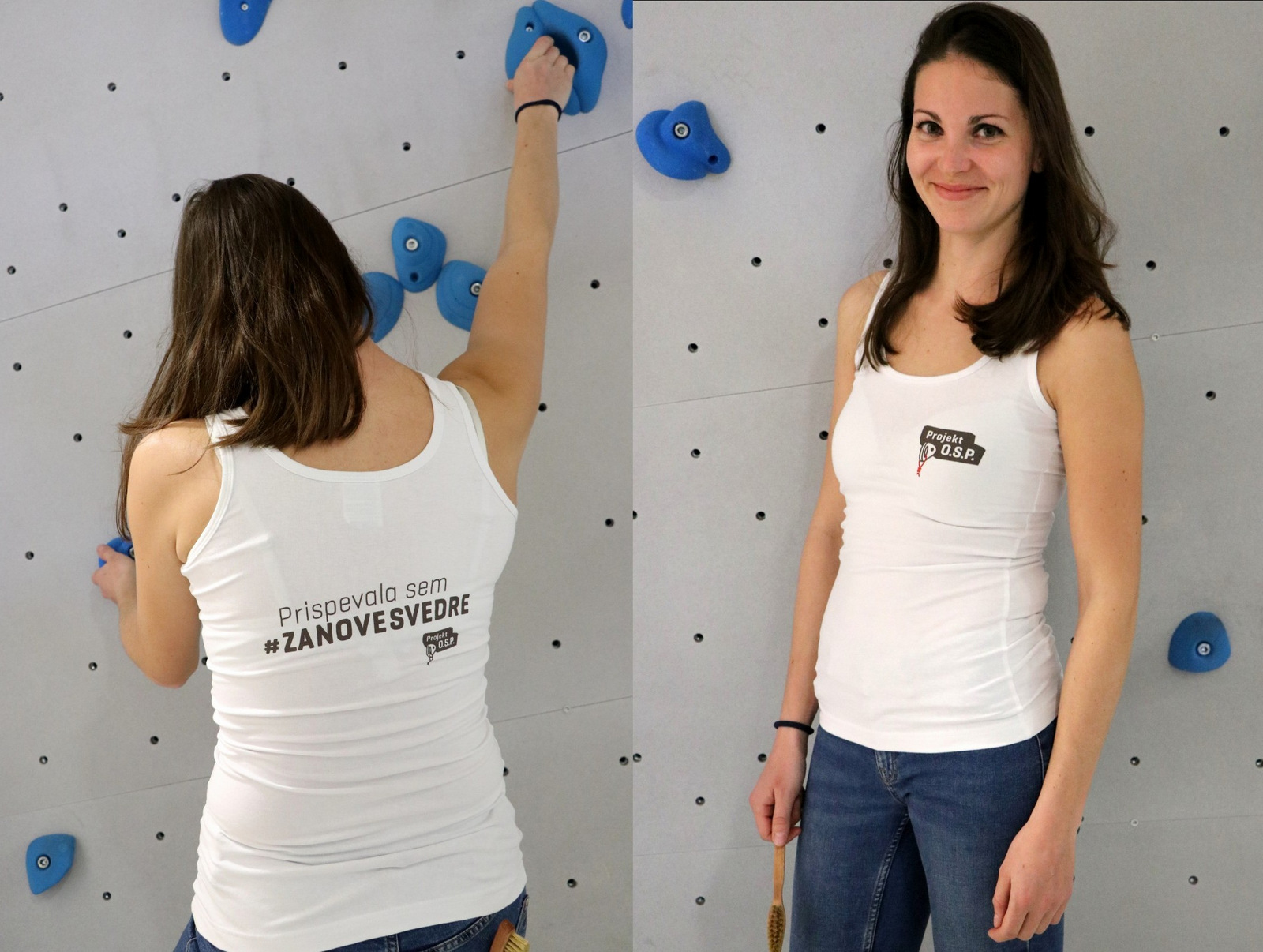Ženska športna majica Projekt OSP je kakovostna telirana bombažna majica brez rokavov, prav tako bele barve, na prsni strani je logotip projekta OSP, na hrbtni pa zgovoren napis Prispevala sem #zanovesvedre. Z nakupom majice boste podprli opremljanje in vzdrževanje slovenskih plezališč ter tako varnejše plezanje. Na voljo so še naslednje številke: 6 x XS, 17 x S in 1 x M.