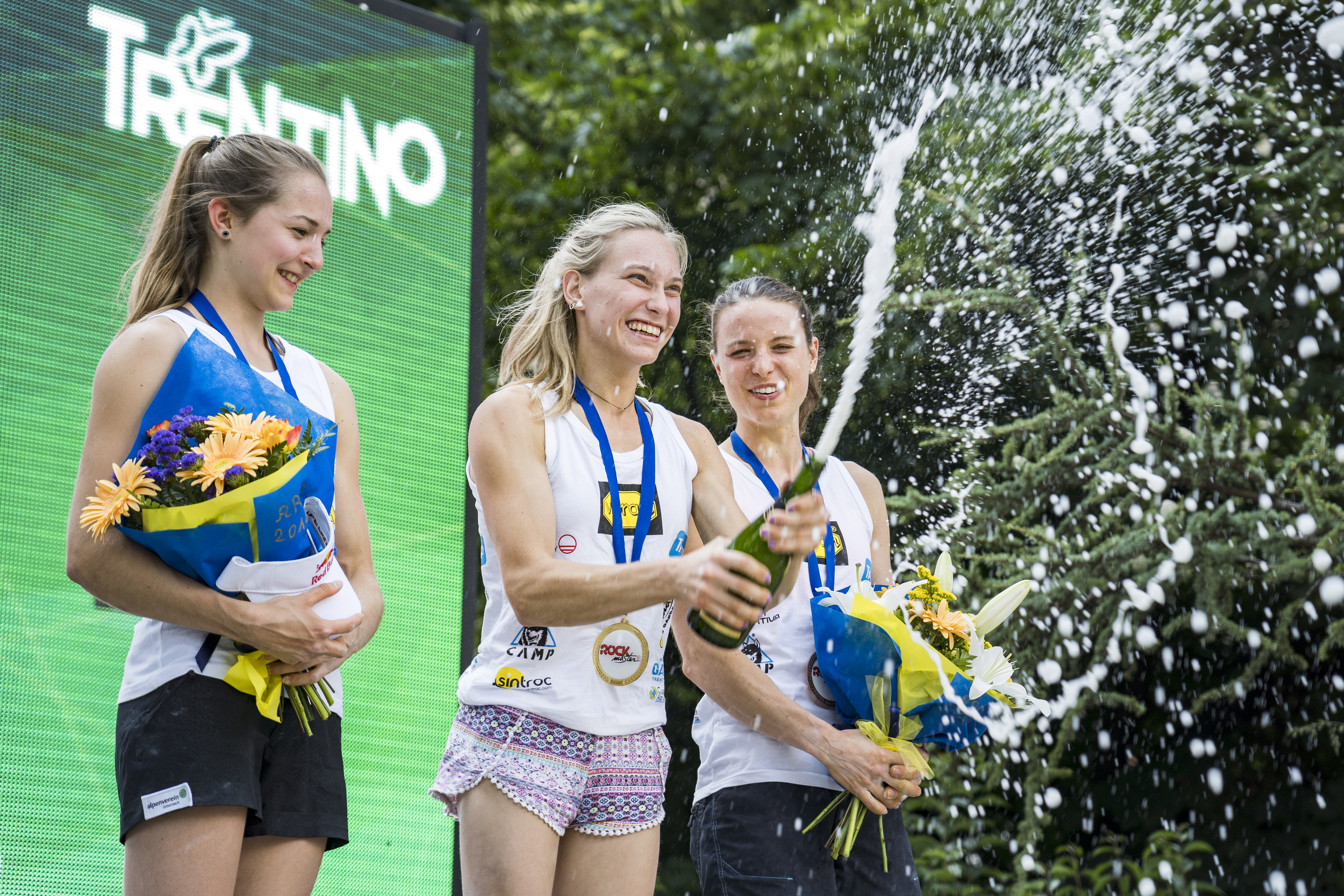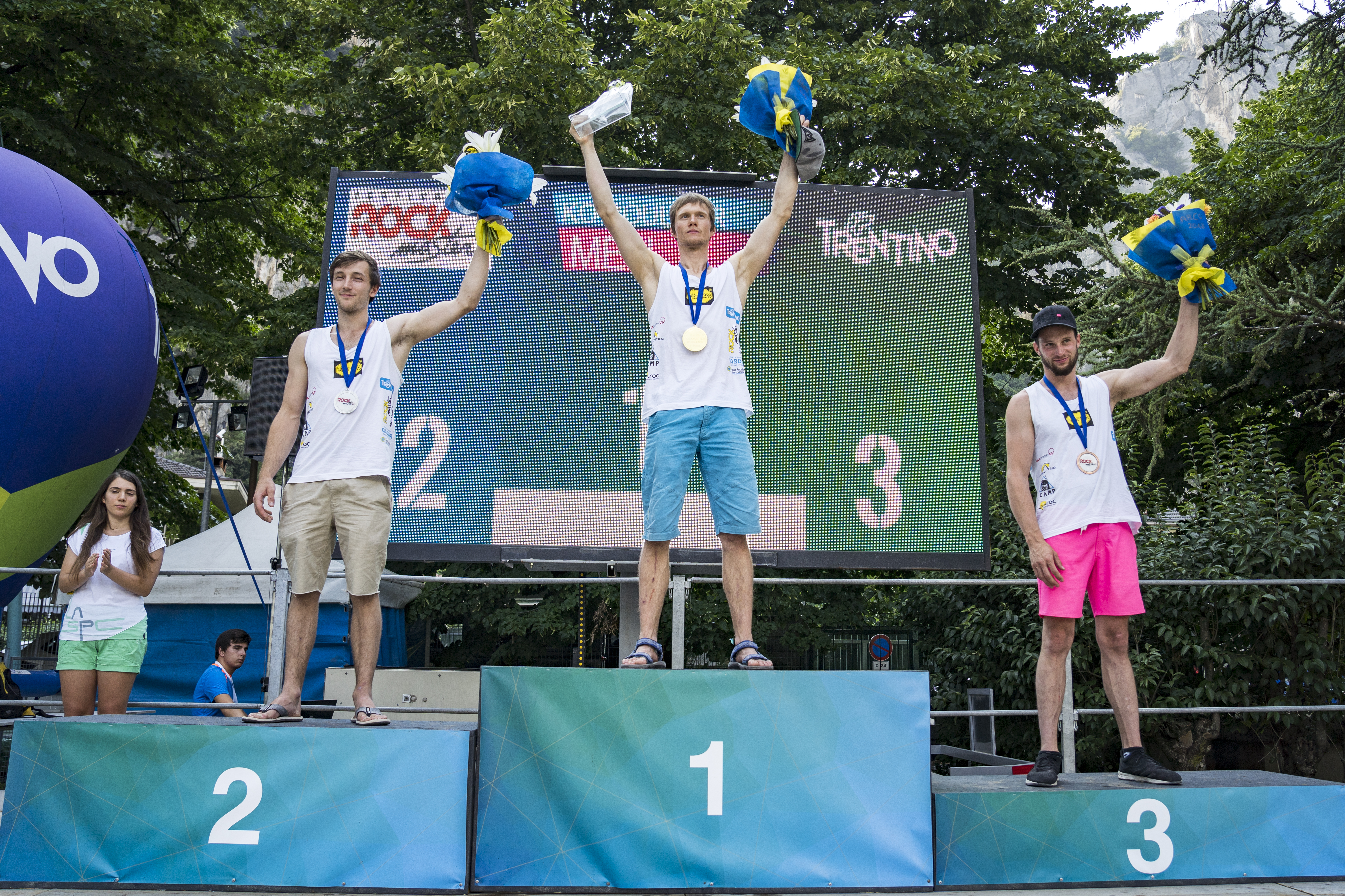 Garnbretova, Vezonik in Kruder na stopničkah Rock Mastra v Arcu (vir Rock Master 2018)