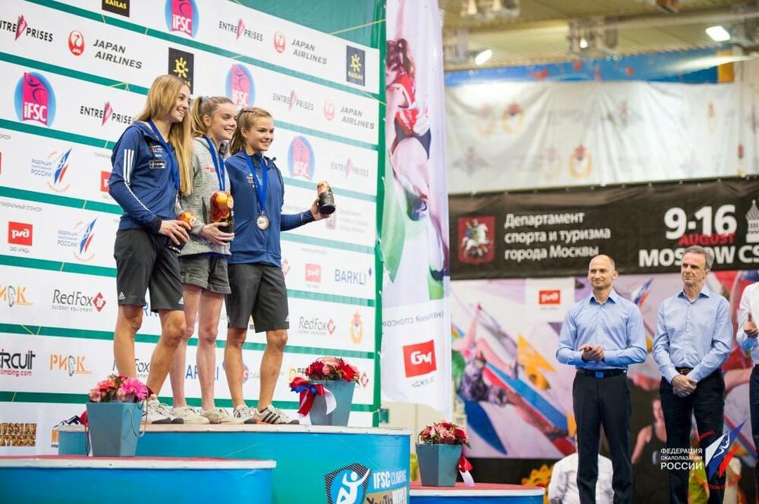 Urška Repušič druga in Vita Lukan tretja na mladinskem svetovnem prvenstvu v balvanskem plezanju med mladinkami (foto Yamaliev Timur)