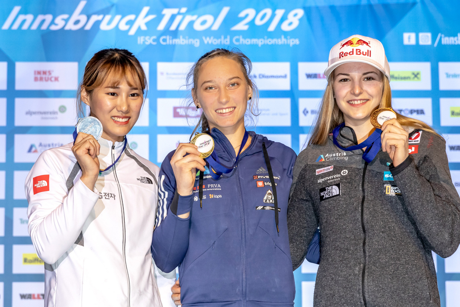 Zmagovalka kombinacije Janja Garnbret, drugouvrščena Južna Korejka Sol Sa in Avstrijka Jessica Pilz na tretjem mestu (foto Luka Fonda)