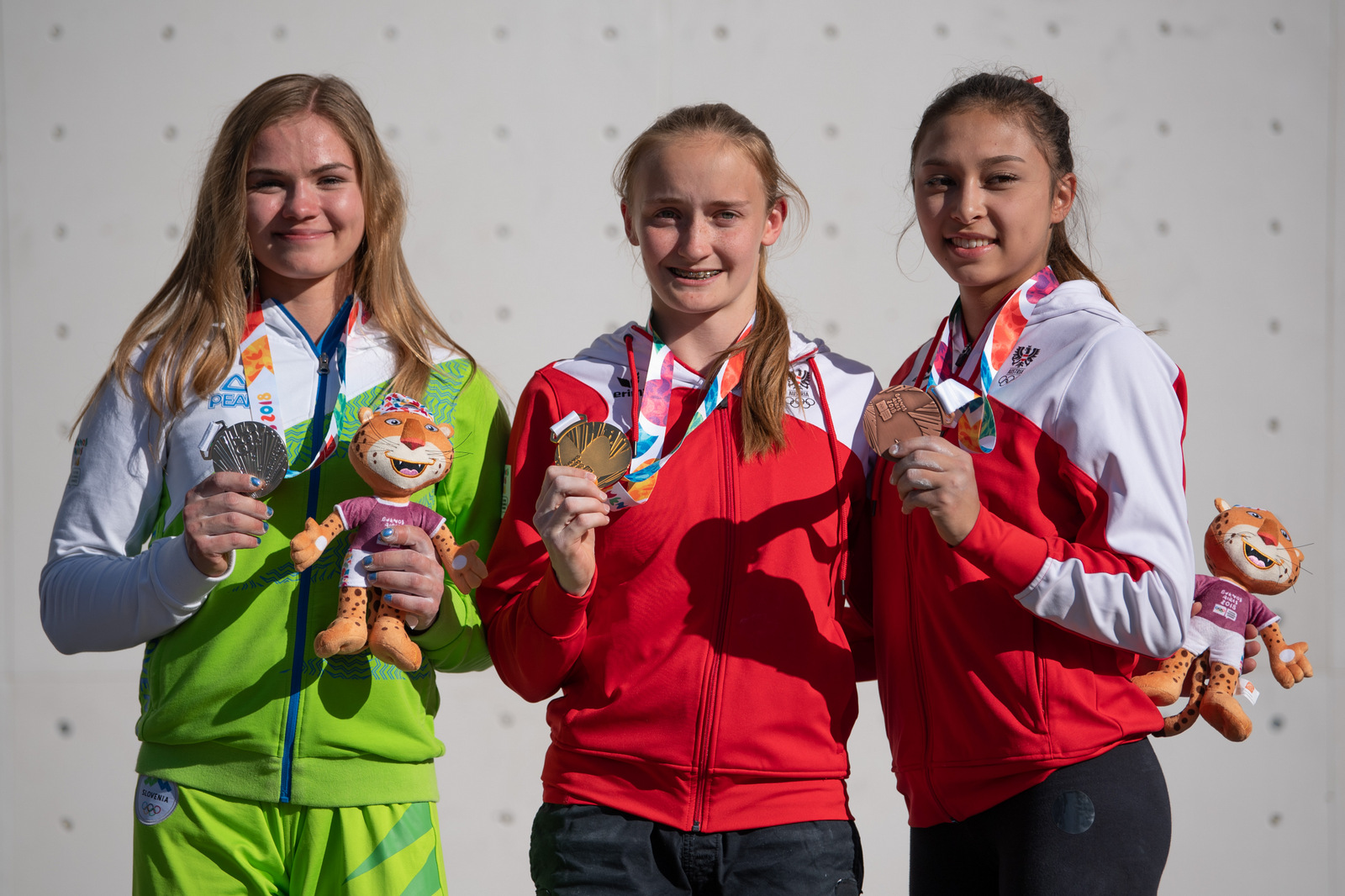 Slovensko-avstrijske stopničke na mladinskih olimpijskih igrah - srebrna Vita Lukan, zlata Sandra Lettner in bronasta Laura Lammer (foto OKS)