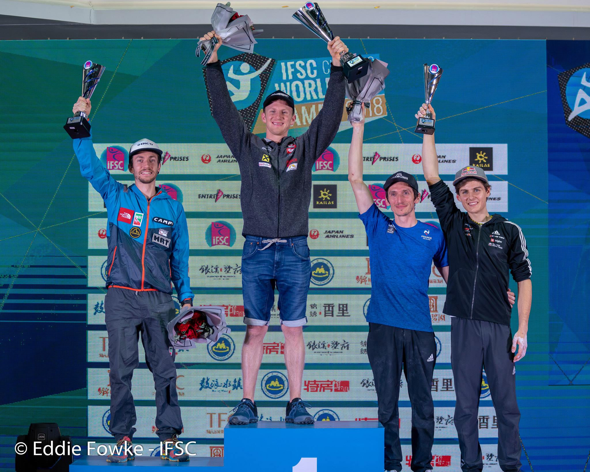 Z zmago na zadnji tekmi SP 2018 v težavnosti si je Domen Škofic zagotovil tudi tretje mesto v skupnem seštevku sezone, ki si ga deli z Romainom Desgrangesom (FRA). Skupni zmagovalec je Jakob Schubert (AVS), drugi Stefano Ghisolfi (ITA). (foto Eddie Fowke - IFSC)