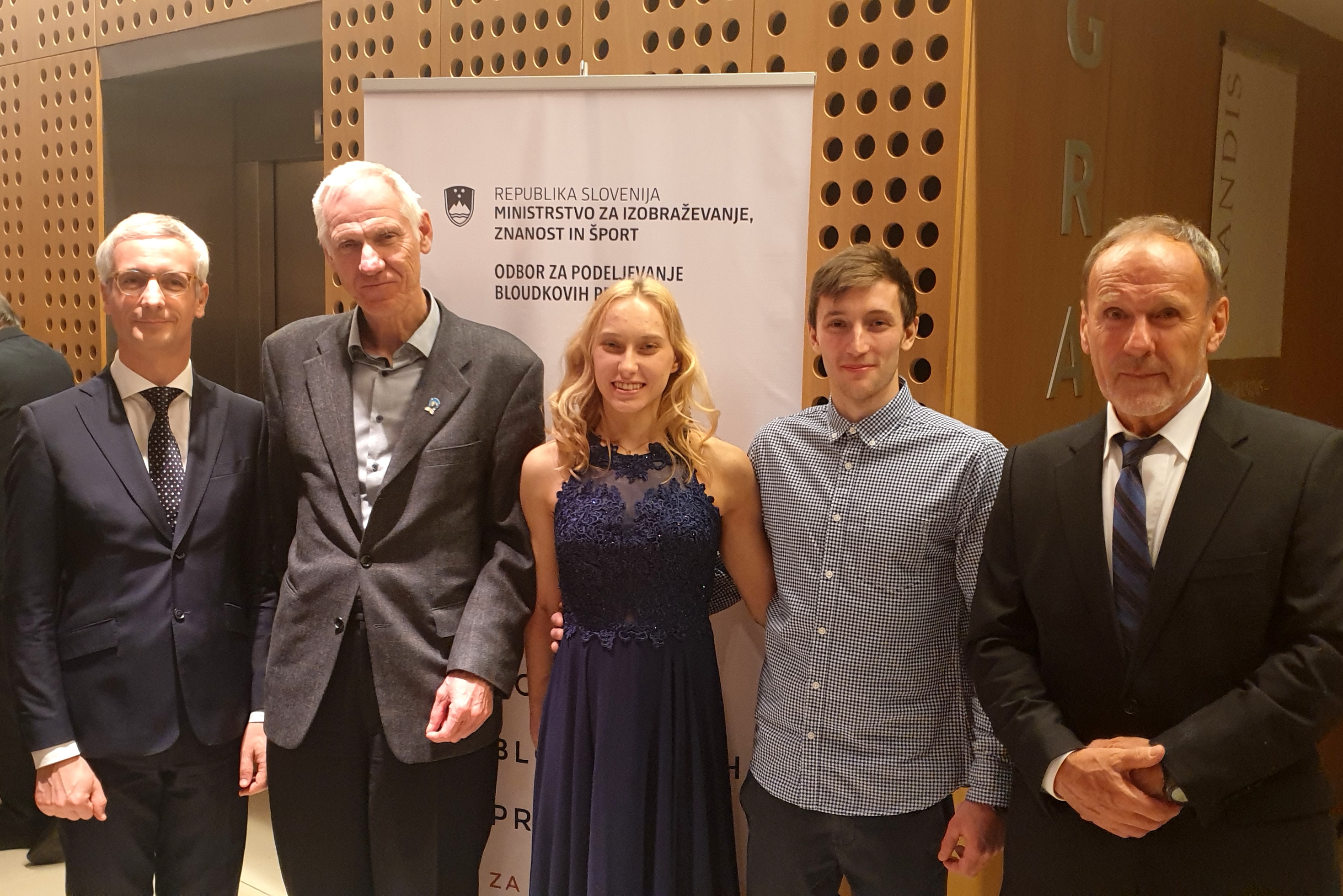 Prejemnica Bloudkove nagrade Janja Garnbret in prejemnik Bloudkove plakete Gregor Vezonik z ministrom za izobraževanje, znanost in šport Jernejem Pikalom, predsednikom PZS Jožetom Rovanom in alpinistom Vikijem Grošljem, članom odbora za podeljevanje Bloudkovih priznanj (foto Matej Planko)