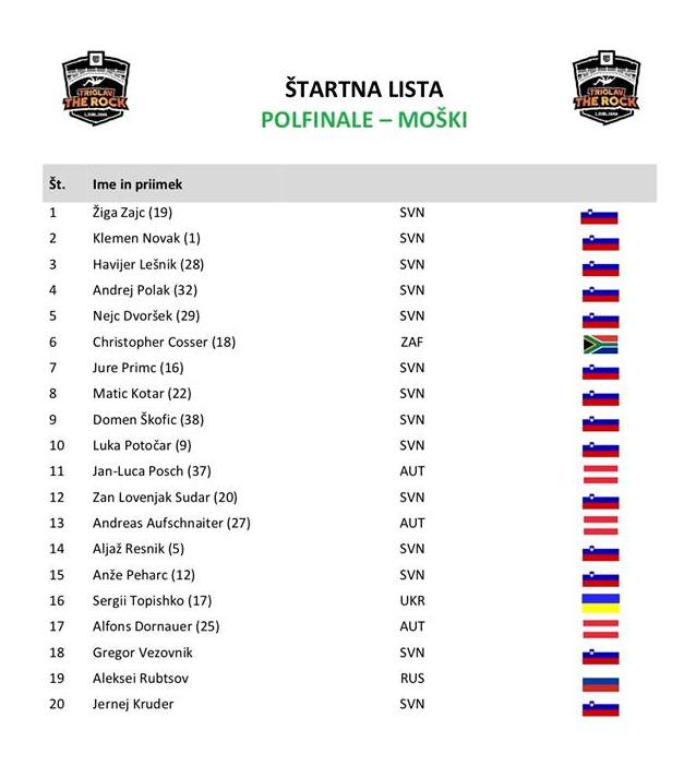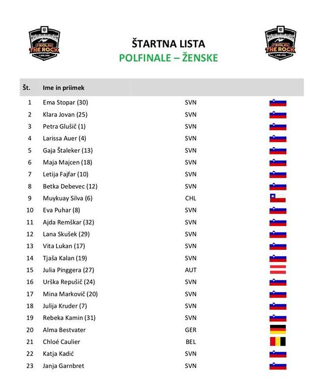 Po petkovih kvalifikacijah v Bolder Sceni je znana štartna lista za sobotni polfinale balvanskega tekmovanja Triglav the Rock Ljubljana. Vabljeni navijat na Kongresni trg ob 13.00, veliki finale pa bo ob 20.00.