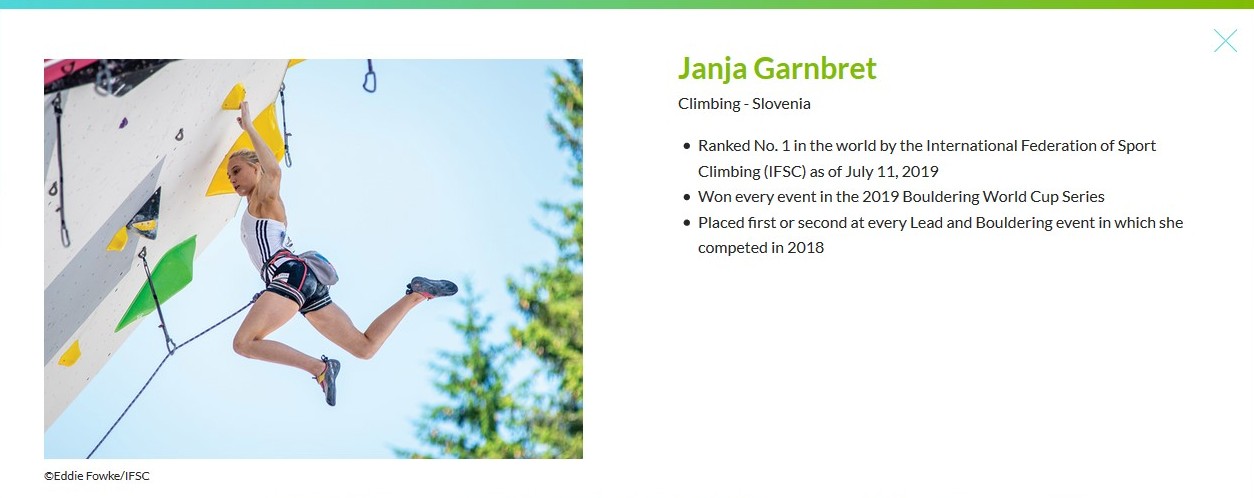 Fundacija je Garnbretovo uvrstila med finalistke zaradi njenih izjemnih dosežkov v športnem plezanju v zadnjem letu, saj je športna plezalka št. 1 na lestvici Mednarodne zveze za športno plezanje (IFSC), zmagala je na vseh tekmah svetovnega pokala 2019 v balvanskem plezanju in se na vseh tekmah v težavnosti in balvanih, na katerih je nastopila v letu 2018, uvrstila na prvo ali drugo mesto.