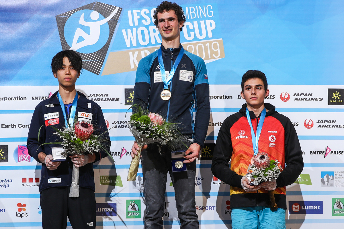 Čeh Adam Ondra že četrtič zmagovalec kranjske tekme, Japonec Kai Harada na drugem in Španec Alberto Gines Lopez na tretjem mestu (foto Stanko Gruden)