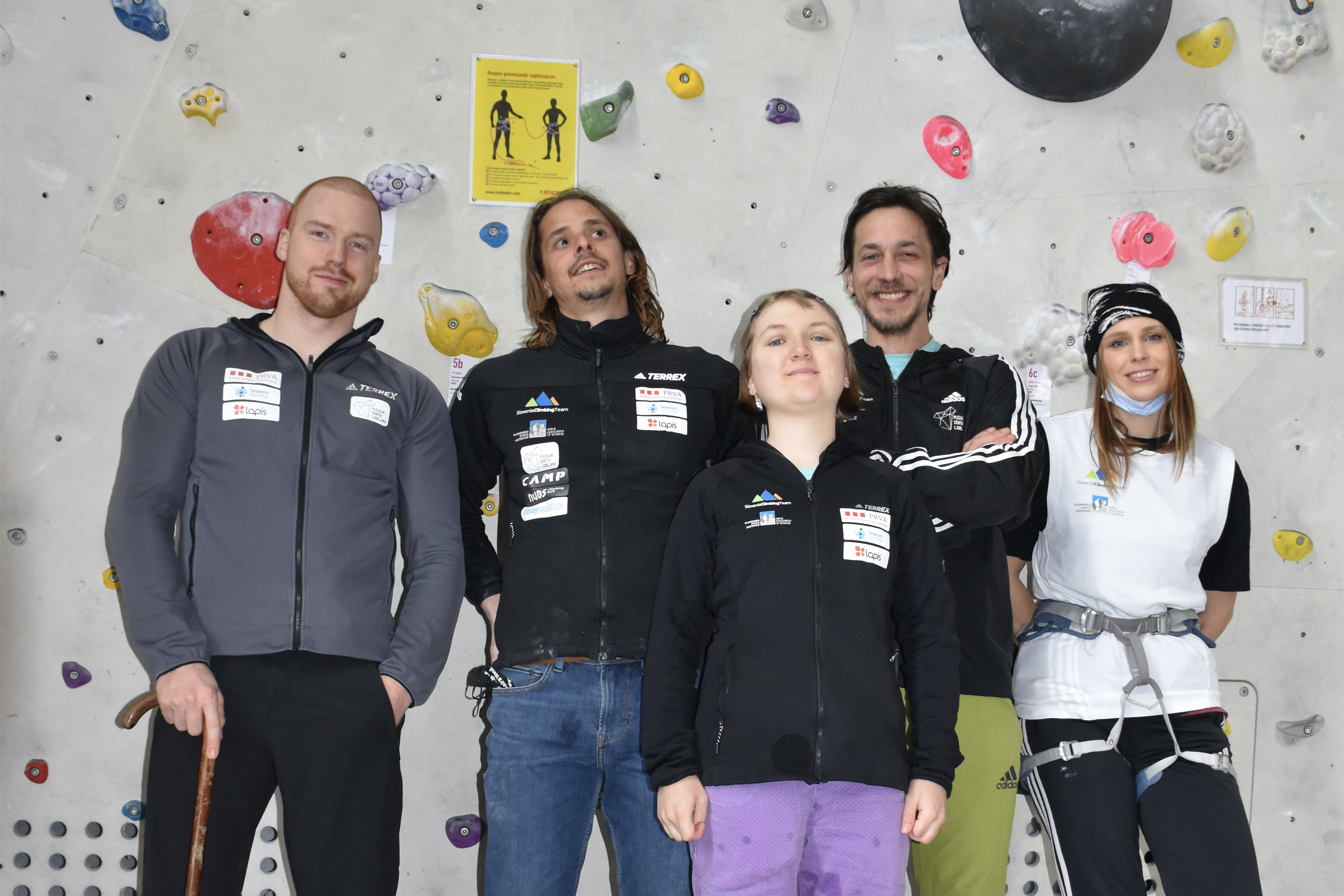 Člani slovenske paraplezalne reprezentance: Matej Arh, Gregor Selak, Tanja Glušič, selektor Jurij Ravnik in Manca Smrekar (foto arhiv Jurija Ravnika)