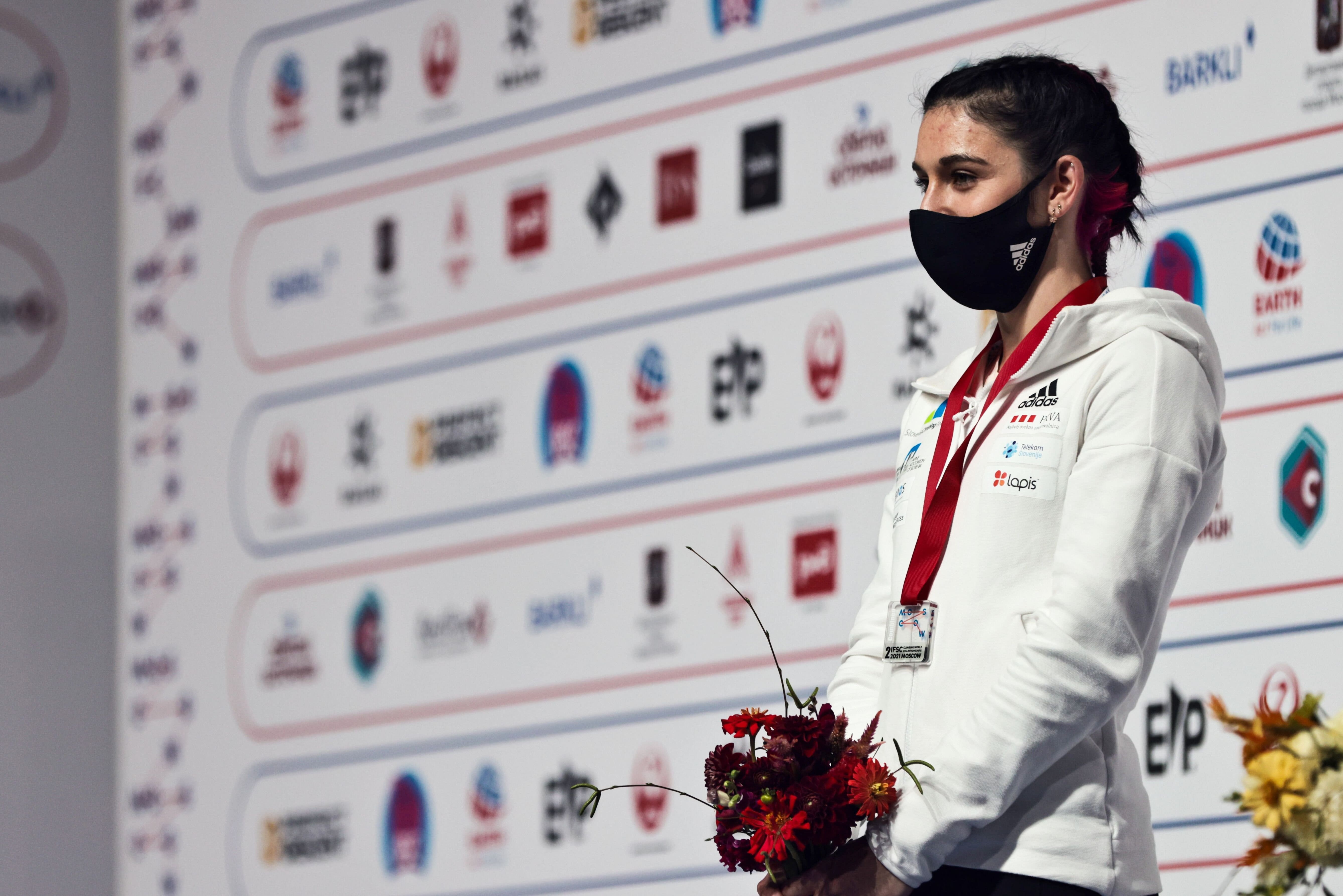 Mia Krampl s srebrno medaljo v kombinaciji svetovnega prvenstva 2021 v športnem plezanju (foto Luka Fonda)