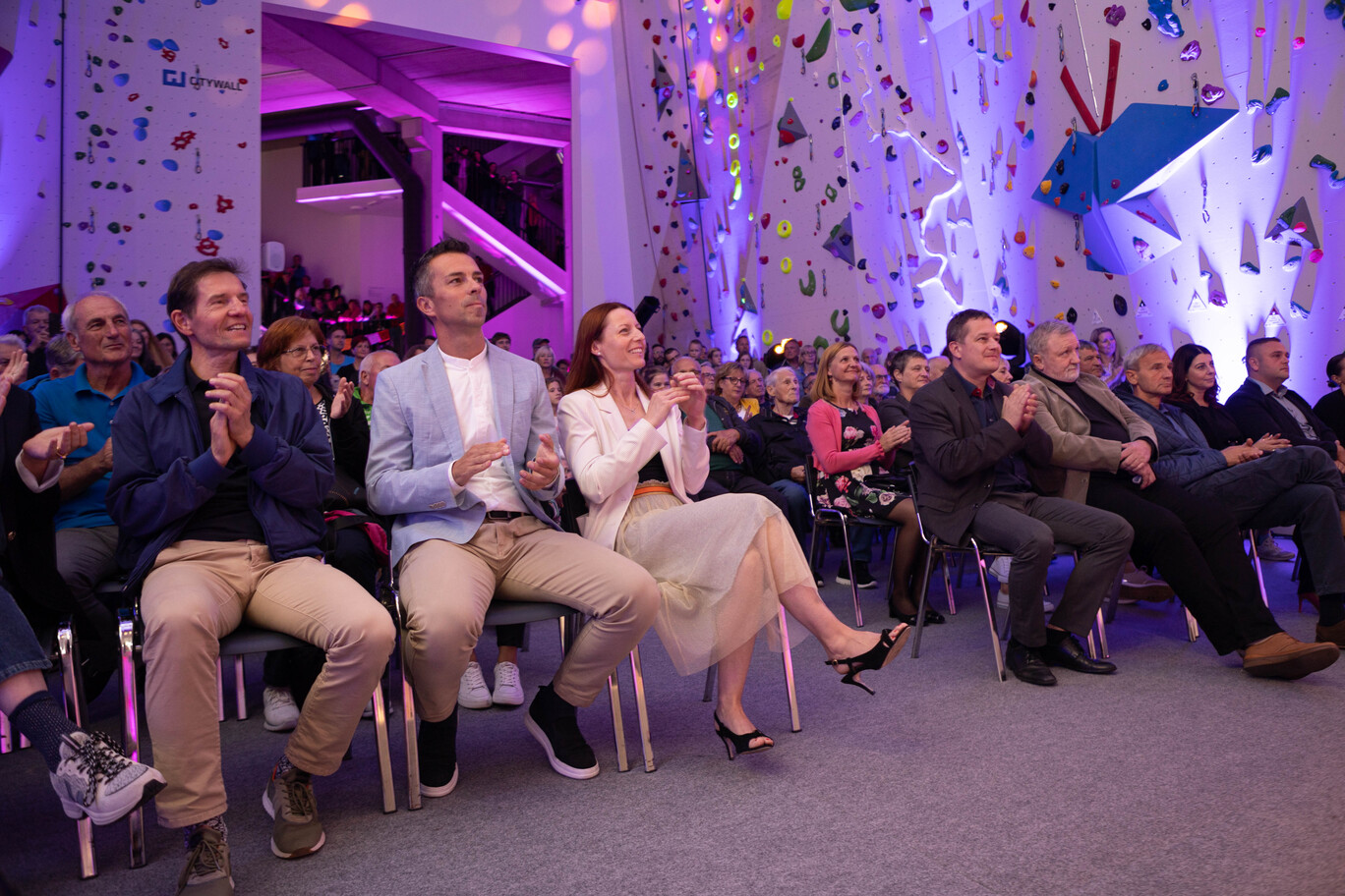 Navdušenje zbrane množice ob odprtju Plezalnega centra Slovenska Bistrica, največjega v Sloveniji (foto Samo Mikulič)
