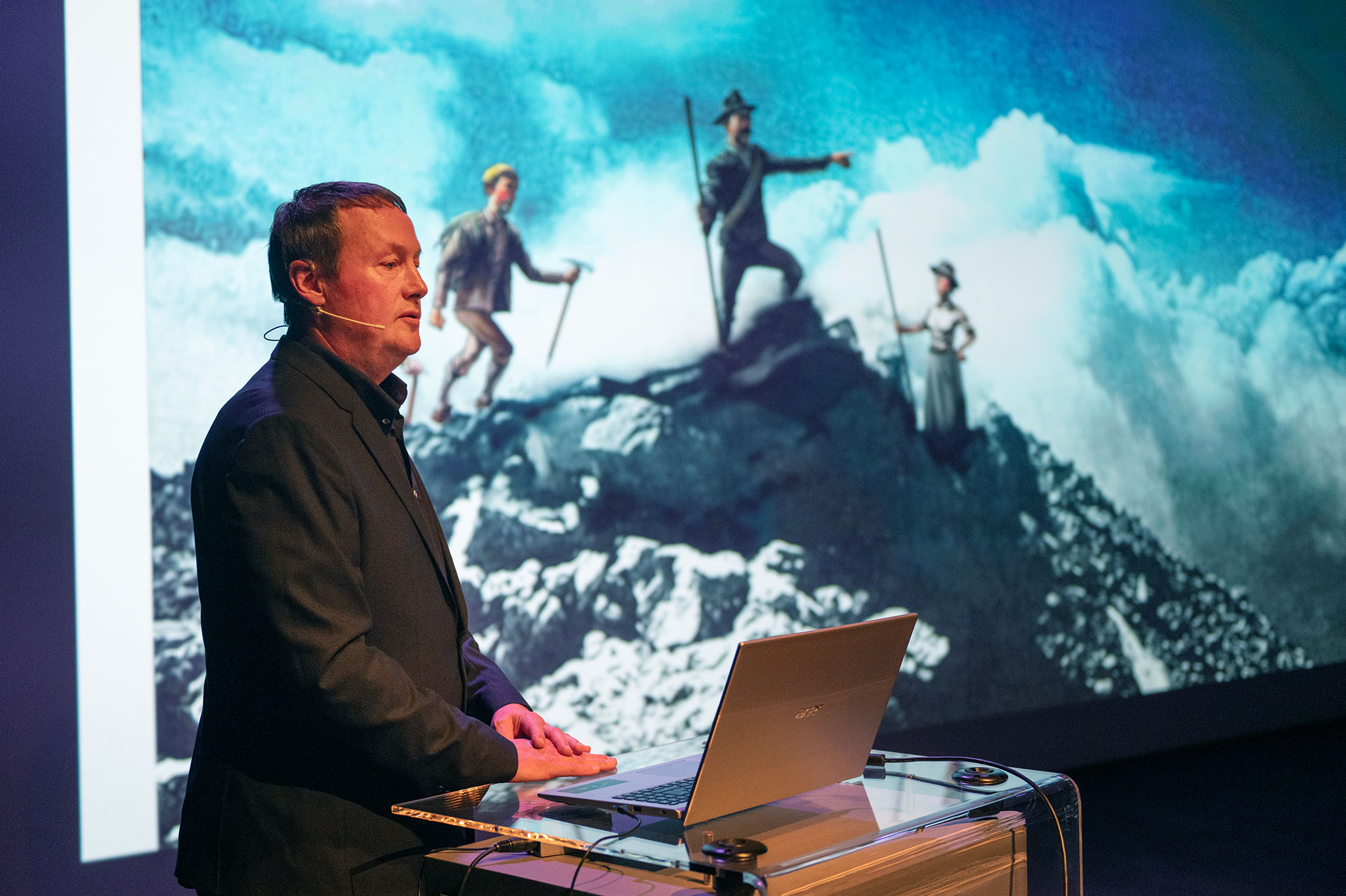 Predavanje Dušana Škodiča o začetkih organiziranega planinstva in alpinizma v času Slovenskega planinskega društva, ki jih je slikovito popisal v knjigi Triglav je naš, predstavil pa tudi na 18. Festivalu gorniškega filma. (foto Igor Kuster/FGF)
