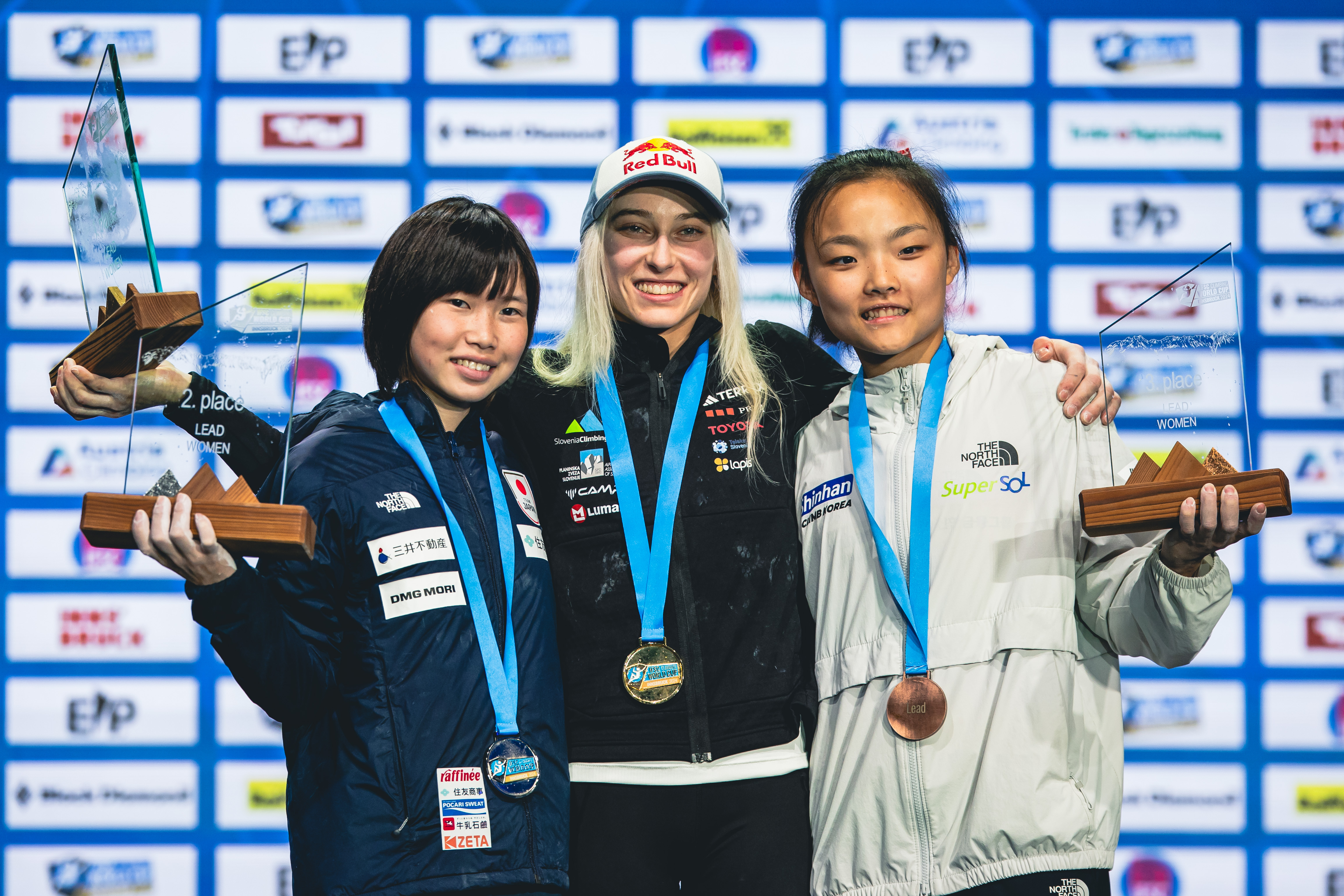 Srebrna Japonka Ai Mori, zlata Slovenka Janja Garnbret in bronasta Korejka Chaehyun Seo na zmagovalnem odru tekme SP v težavnostnem plezanju v Innsbrucku (foto Grega Valančič)