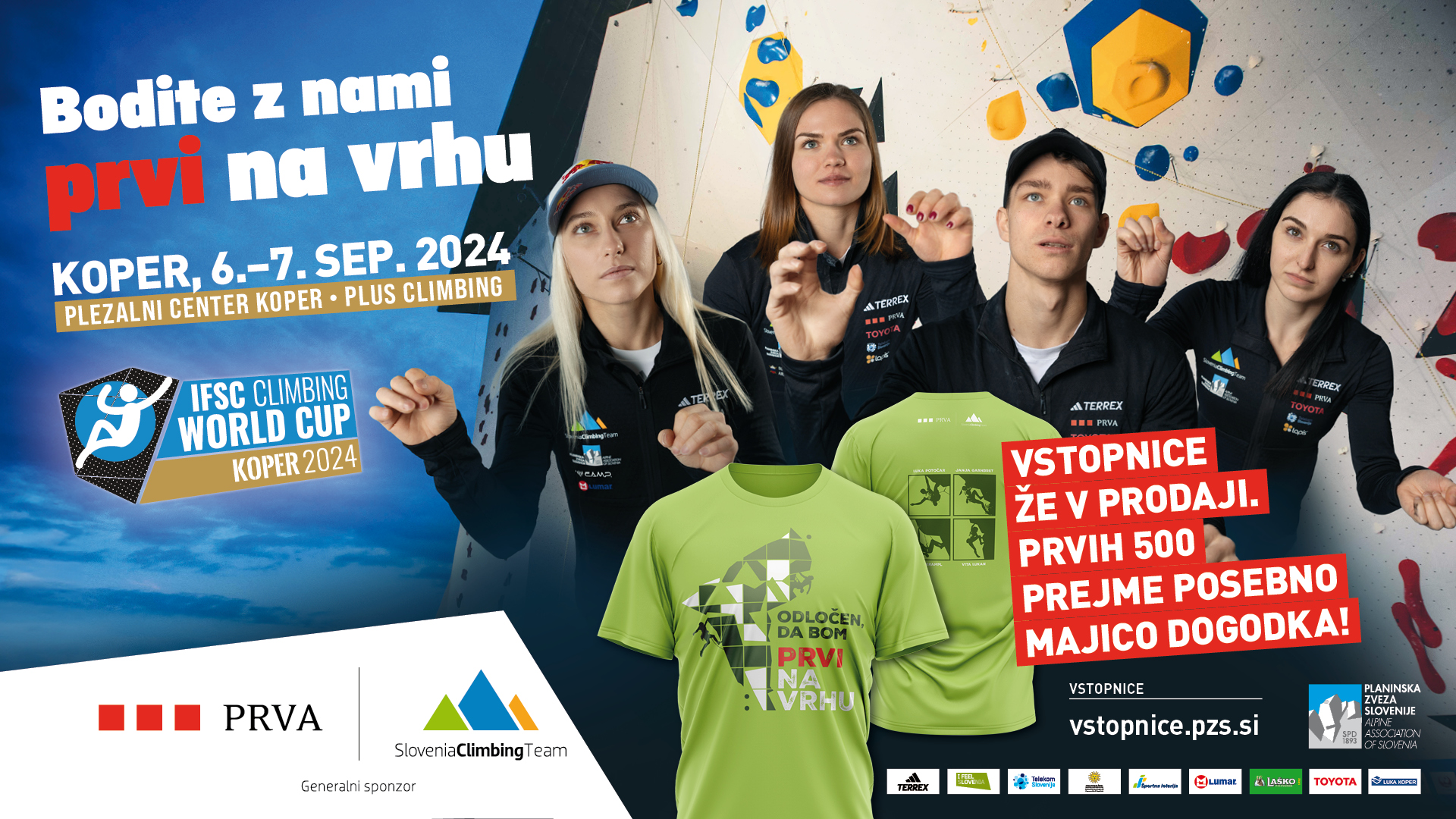 V ponedeljek, 8. julija, se začne predprodaja vstopnic za tekmo svetovnega pokala v športnem plezanju Koper 2024, ki bo 6. in 7. septembra na zunanji plezalni steni Plezalnega centra Koper. Prvih 500 kupcev vstopnic za ogled sobotnega finala ob nakupu brezplačno prejme spominsko majico, s katero bodo imeli tudi vstop na poseben prostor na prizorišču tekme.